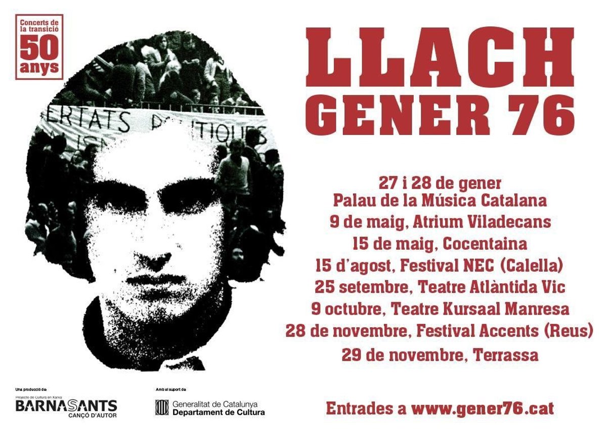 Tras su paso por el Barnasants, 'Llach-Gener 76' hará una gira por diversas poblaciones: Atrium Viladecans (9 de mayo), Concentaina (15 de mayo), Festival NEC de Calella (15 de agosto), Teatre L'Atlàntida de Vic (25 de septiembre), Teatre Kursaal de Manresa (9 de octubre), Festival Accents de Reus (28 de noviembre) y Teatre La Fact de Terrassa (29 de noviember).