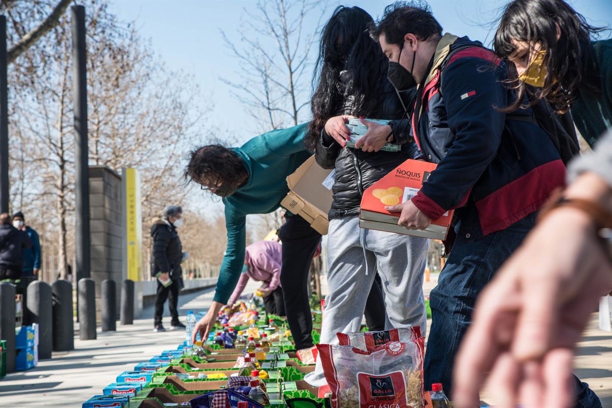 Decenas de voluntarios se han reunido esta mañana en el Parc Nou de El Prat de Llobregat (Barcelona) para construir cajas de alimentos que la fundación entrega cada mes, con el apoyo de El Banc dels Aliments, a artistas del país en "una situación de precariedad extrema".