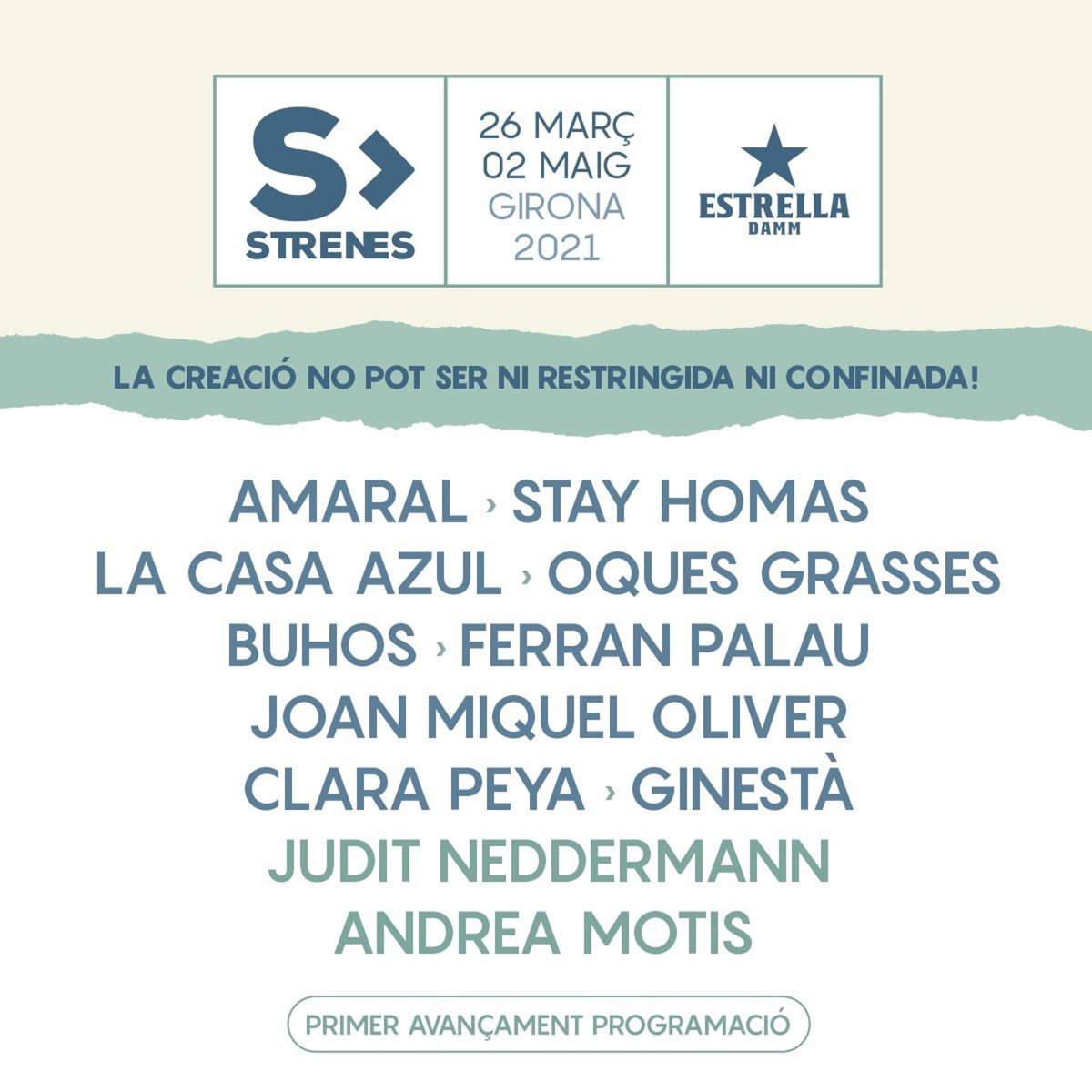 El Festival Strenes de Girona, que se celebrará del 26 de marzo al 2 de mayo, contará con un concierto acústico de Amaral y los estrenos en directo de los nuevos discos de Oques Grasses, Stay Homas, Ferran Palau y Judit Neddermann.