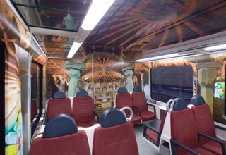 La decoración del tren adapta elementos arquitectónicos de la cripta con la configuración y particularidades del interior de los vagones: se ha ambientado el techo, las puertas, los laterales, las partes posteriores de los asientos y la pared final del tren con elementos visuales que simulan las paredes, el techo, las vitrinas y los bancos de la cripta.