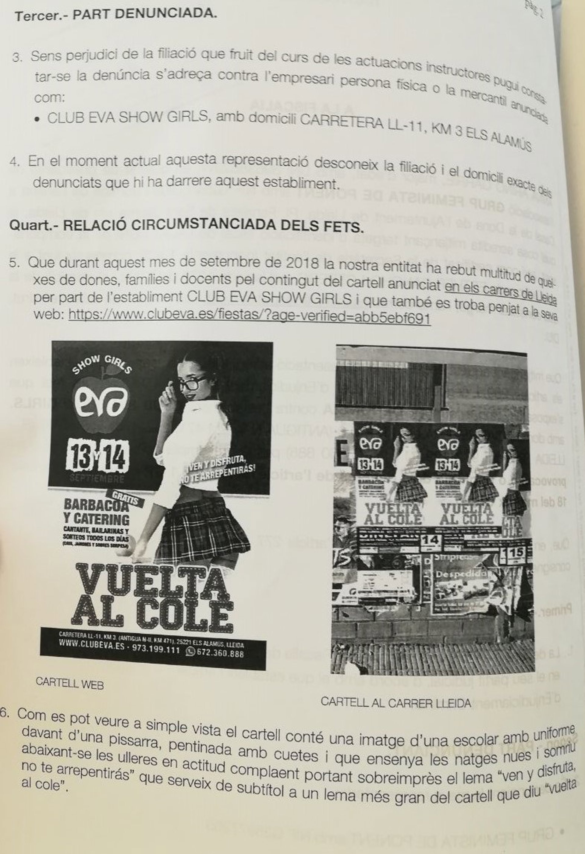La Fiscalía de la Audiencia de Lleida ha abierto diligencias para investigar la denuncia de Dones de Lleida contra la publicidad de un club de 'show girls' en Els Alamús (Lleida) que promociona el local con la imagen de una chica vestida de colegiala y la leyenda 'Vuelta al cole'.