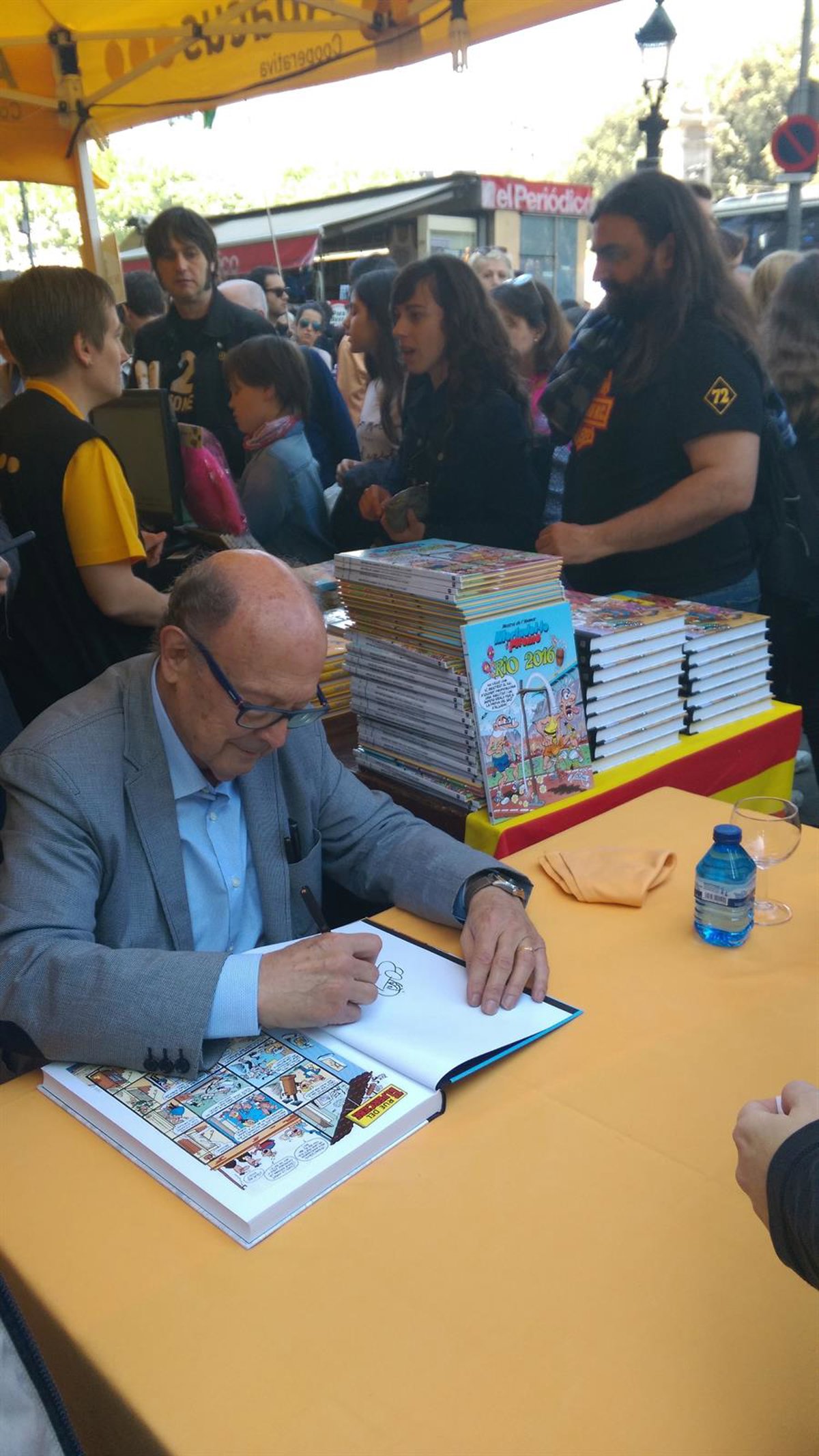 Ibáñez ha llegado a las 11.30 horas a los puestos situados en Plaza Cataluña, donde le esperaba una larga cola de admiradores con sus cómic, y envuelto de una gran cobertura mediática.