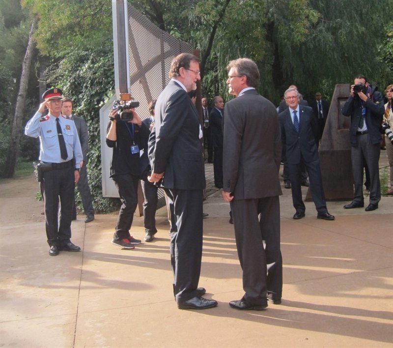 Los presidentes del Gobierno y de la Generalitat, Mariano Rajoy y Artur Mas, se han dado un frío saludo este miércoles por la mañana en el I Foro Económico del Mediterráneo occidental, en el Palau de Pedralbes de Barcelona.