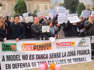 Los más de 150 funcionarios de prisiones concentrados ante el Parlament lo han hecho ante una pancarta de los tres sindicatos convocantes con el lema 'La Modelo no se cierra sin la Zona Franca. En defensa de todos los puestos de trabajo'.