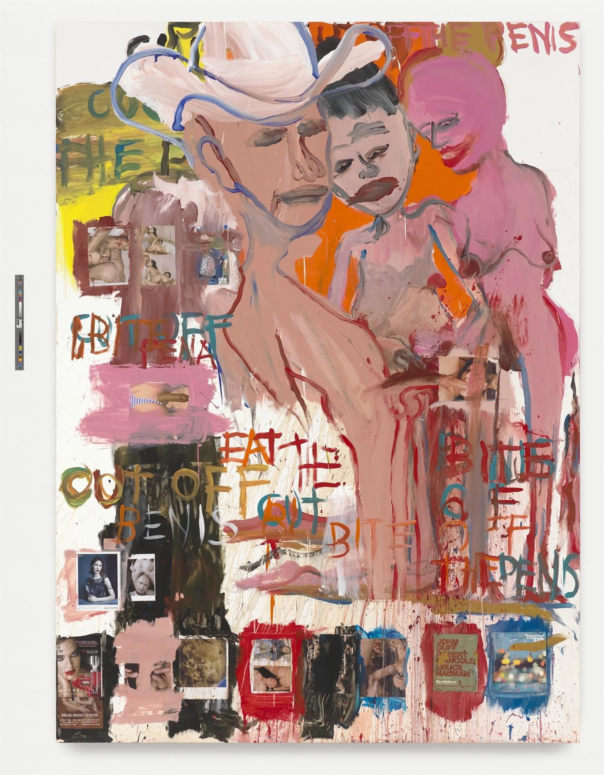 En las pinturas de gran formato, incrusta páginas de revistas, pequeñas láminas y documentos para contextualizar su crítica como por ejemplo, la cara de una modelo, un actor, un personaje animado o una lámina de Claude Monet.