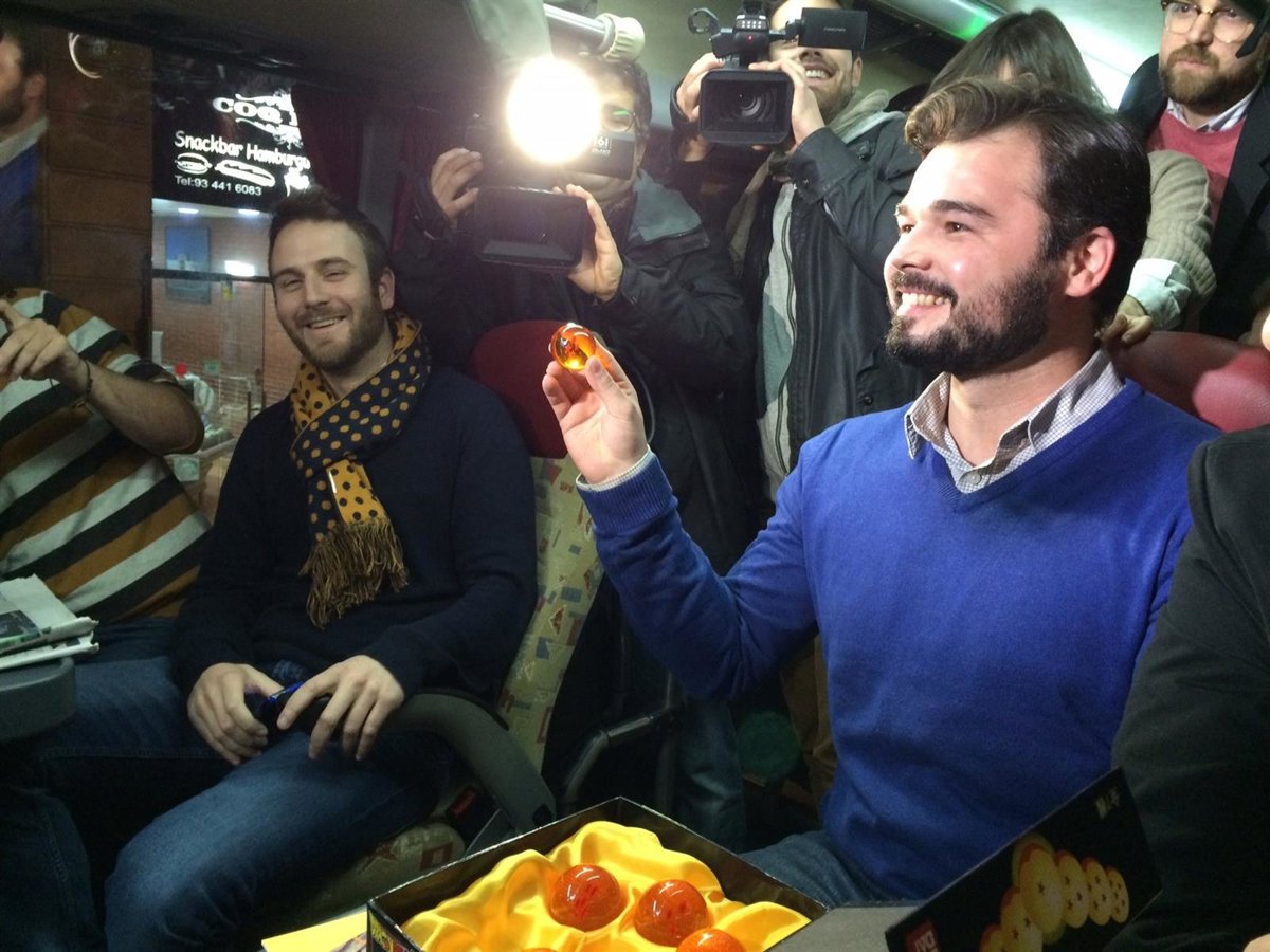 Tanto él como su número dos, Joan Tardà, han subido este lunes al autobús de campaña que ha llevado a los periodistas hasta Manresa para celebrar un mitin y, al principio del viaje, el candidato ha recibido como regalo las siete bolas de la serie de animación japonesa, a las que Rufián hace mención en todos sus mítines.