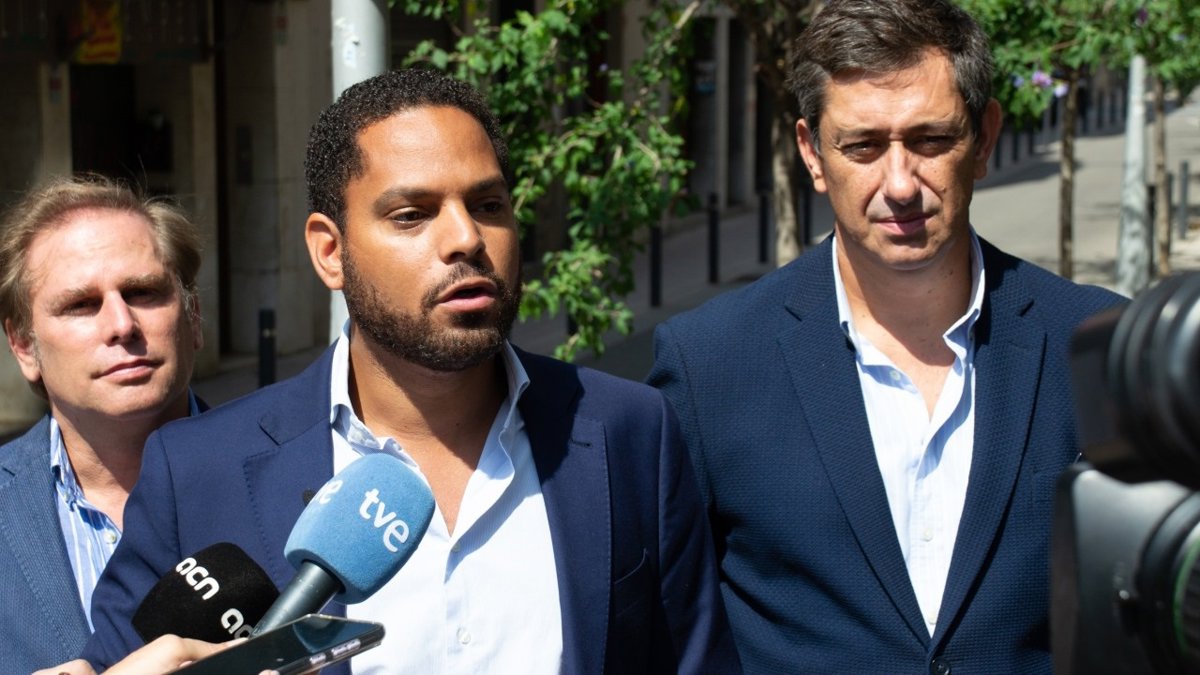 En el centro, el líder de Vox en Catalunya, Ignacio Garriga, durante unas declaraciones a los periodistas el 3 de septiembre de 2021 en Barcelona. - VOX