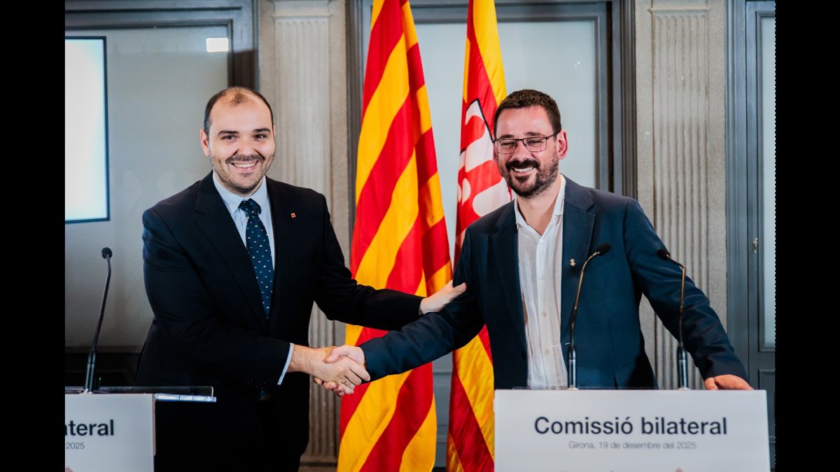 El conseller de la Presidencia de la Generalitat, Albert Dalmau, y el alcalde de Girona, Lluc Salellas, han presidido este viernes la primera reunión de la Comisión Bilateral entre ambas instituciones, un encuentro que ha servido para firmar acuerdos como la aportación del Govern de más de 7 millones de euros para el entorno de la nueva ubicación del Hospital Josep Trueta.