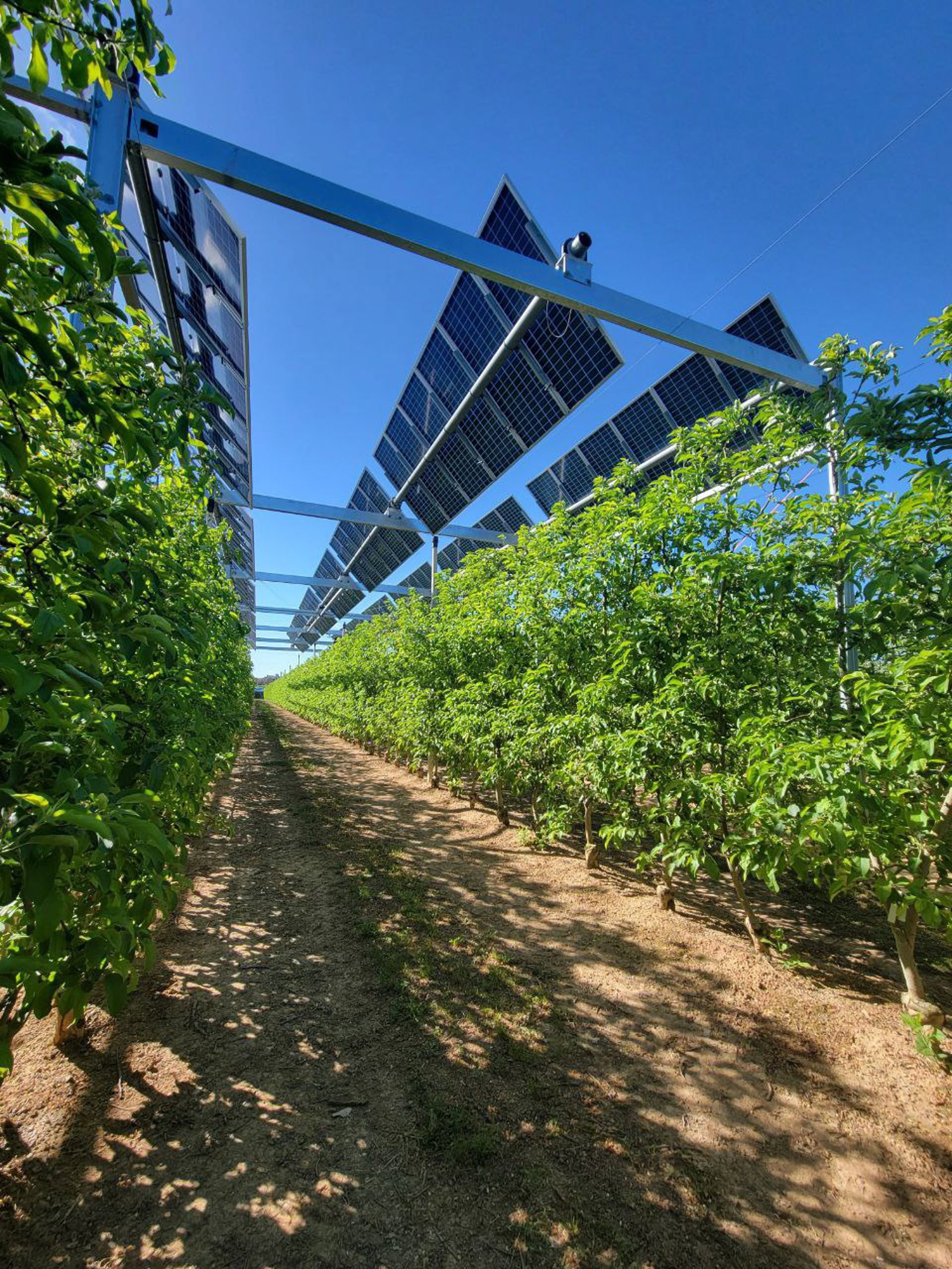El proyecto ubica las placas solares a una altura elevada del terreno agrícola, y deja espacio entre placas para que la luz solar llegue a las plantas cultivadas.