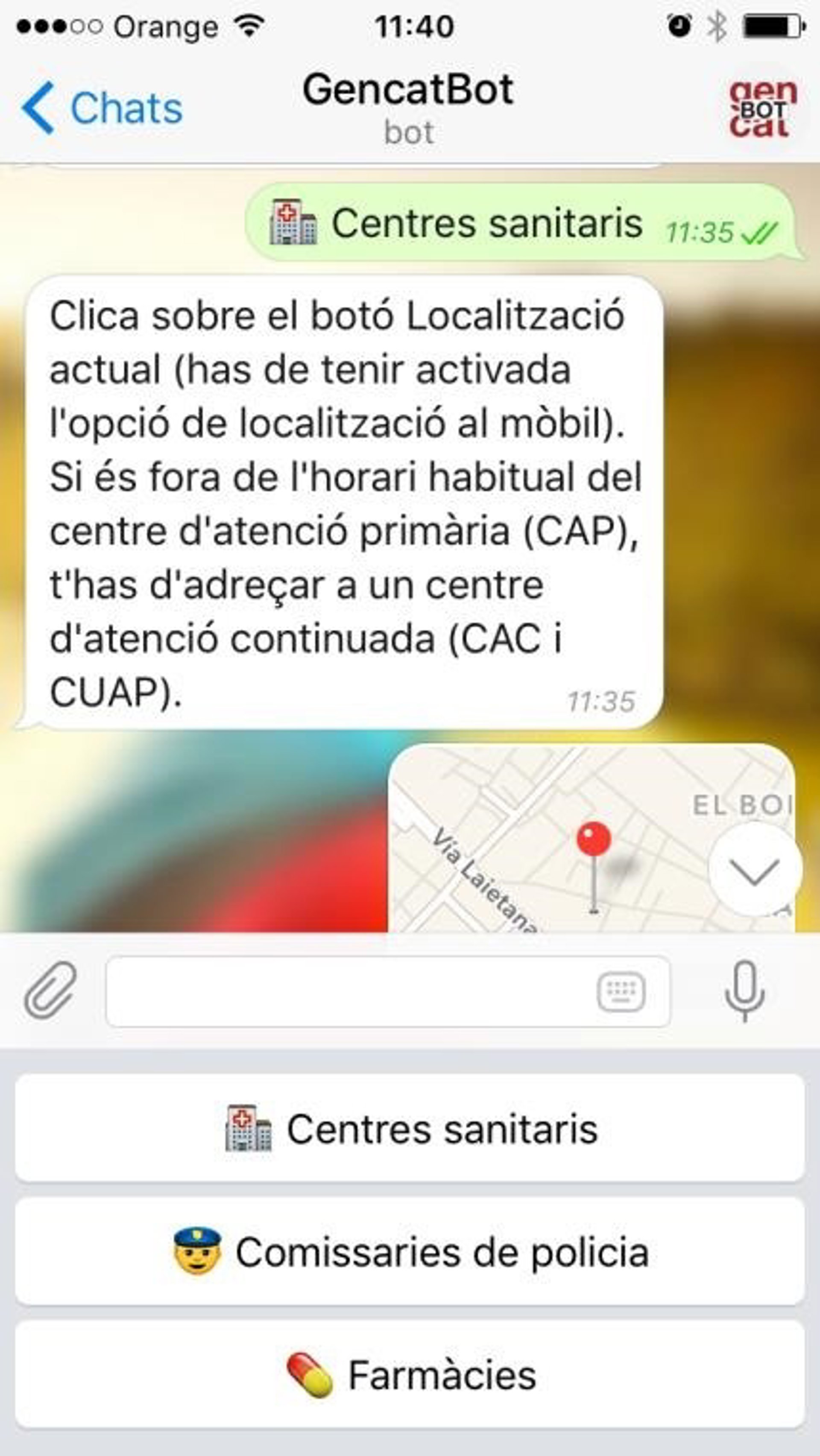 El 'bot' consultará la base de datos de los equipamientos oficiales de la Generalitat y localizará comisarías de policía, farmacias, hospitales, centros sanitarios y centros de atención primaria.