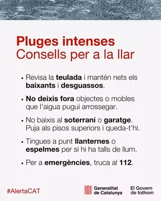 En un mensaje en la red social 'X' la Generalitat recomienda a la población que mantenga limpios los tejados, bajantes y desagües y que, ante una previsión de lluvia intensa, no se dejen fuera objetos o muebles que el agua pueda arrastrar en caso de que se produzca una crecida o inundación.