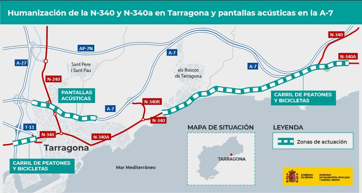 El Ministerio de Transportes, Movilidad y Agenda Urbana ha aprobado "provisionalmente y somete a trámite de información pública" el proyecto de construcción de un carril de peatones y bicicletas en las carreteras N-340 y N-340a y la instalación de pantallas acústicas en la autovía A-7, en Tarragona.