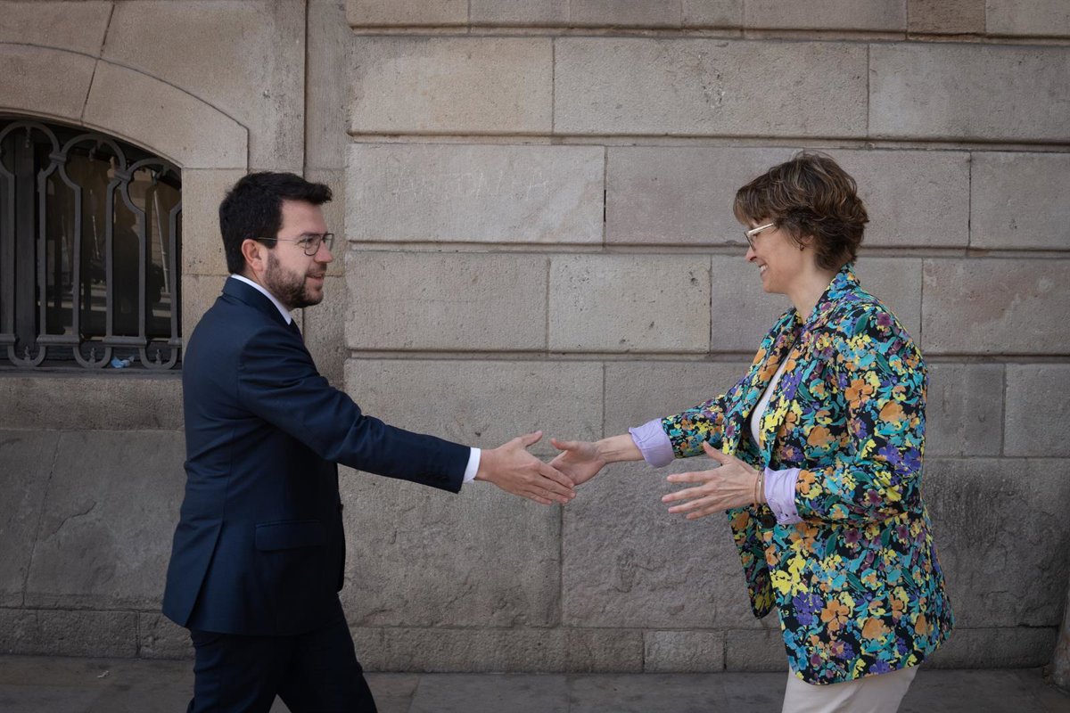 Archivo - El presidente de la Generalitat, Pedro Aragonés y García, y la consejera de Acción Exterior y Unión Europea, Meritxell Serret y Aleu, se saludan a su llegada a la presentación de las líneas estratégicas de la acción exterior catalana para los - David Zorraquino - Europa Press - Archivo