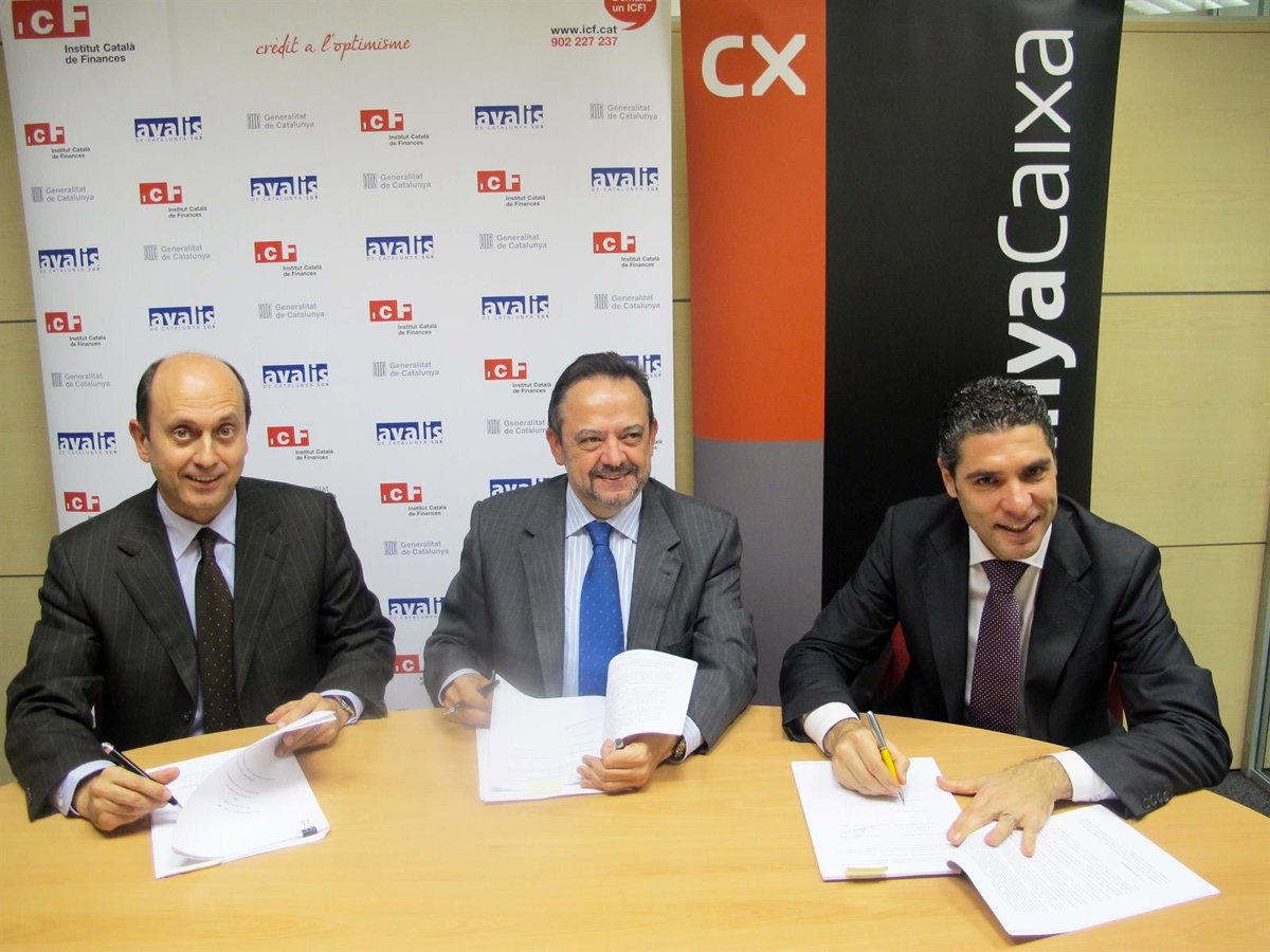El consejero delegado del ICF, Josep-Ramon Sanromà, el consejero-director general de Avalis de Catalunya, Josep Lores, y el director de banca de empresas, corporativa e institucional de CatalunyaCaixa, Lluís Chamorro, han rubricado el convenio de colaboración.