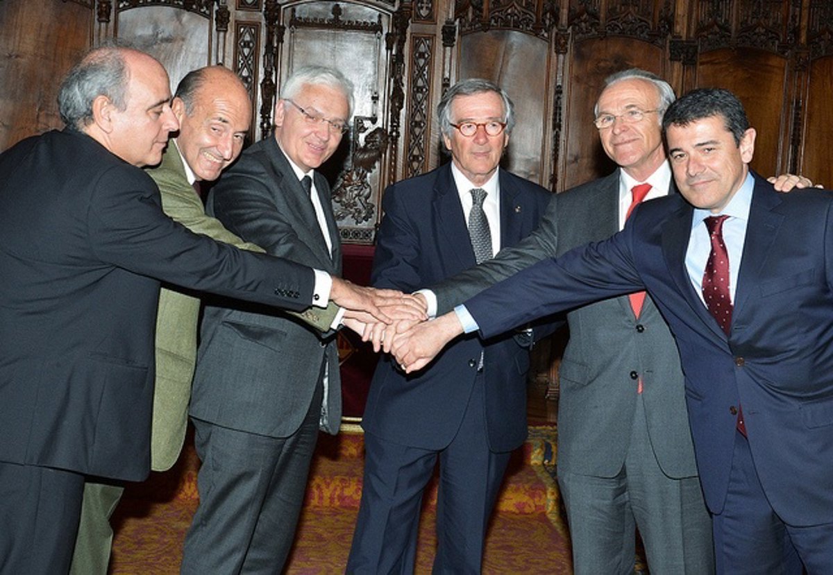 Han firmado este acuerdo el conseller Ferran Mascarell; el alcalde Xavier Trias; el presidente del MNAC, Miquel Roca; el presidente de La Caixa, Isidre Fainé, y el director general de Fira de Barcelona, Agustín Cordón.