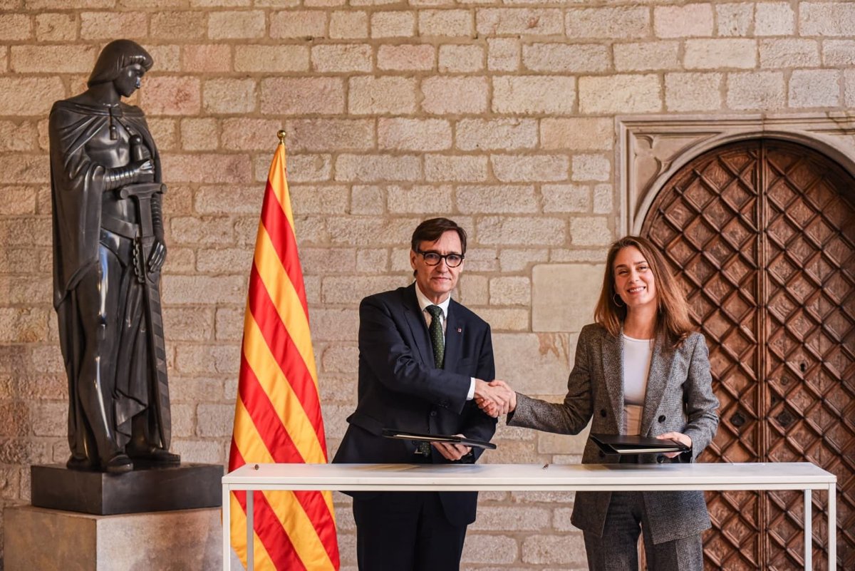 El presidente de la Generalitat, Salvador Illa, y la líder de Comuns en el Parlament, Jéssica Albiach, firman el acuerdo para los Pressupuestos - ALBERTO PAREDES - EUROPA PRESS