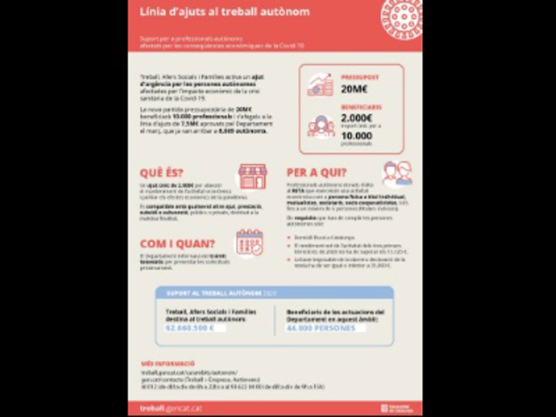 La Conselleria de Trabajo, Asuntos Sociales y Familias de la Generalitat destinará 20 millones de euros en ayudas de 2.000 euros que beneficiarán a 10.000 personas autónomas, ha explicado la Generalitat en un comunicado este viernes.