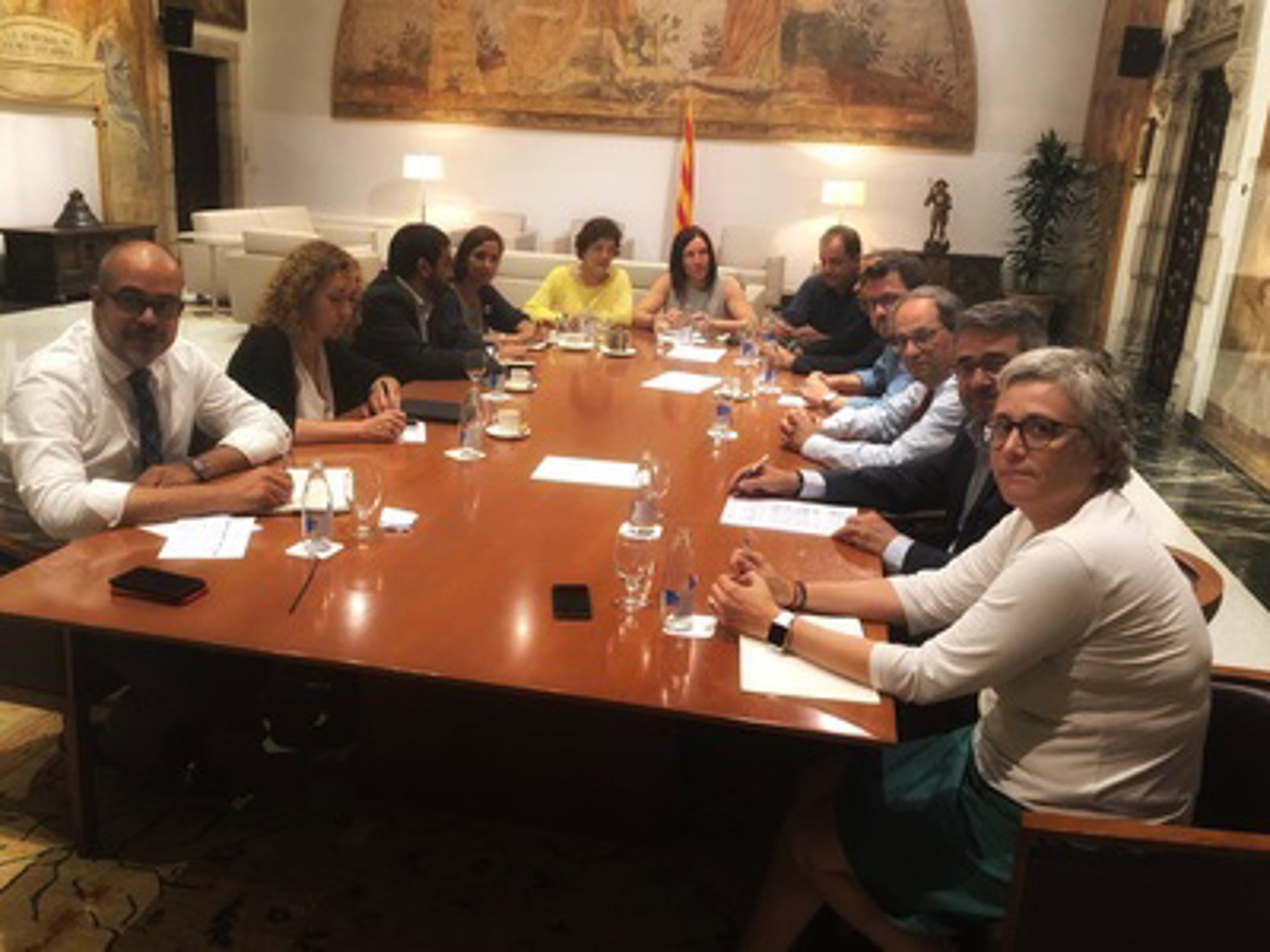 El Govern ha convocado una reunión de urgencia, que se ha celebrado en el Palau de la Generalitat, a la que han asistido el presidente, Quim Torra; el vicepresidente, Pere Aragonès; el conseller de Trabajo, Asuntos Sociales y Familias, Chakir el Homrani; el conseller de Interior, Miquel Buch, y la consellera de Justicia, Ester Capella.