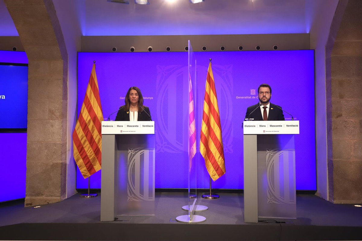 La consellera de Presidencia y portavoz del Govern, Meritxell Budó, y el vicepresidente de la Generalitat, Pere Aragons, en rueda de prensa telemática. - GENERALITAT