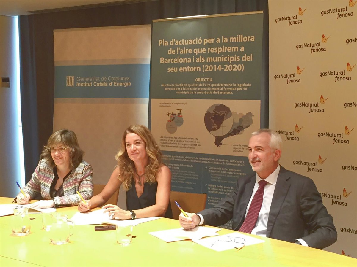 La directora general de Calidad Ambiental del Govern, Assumpta Farran; la directora del Institut Català de l'Energia (Icaen), Mercè Rius, y el director general de Negocios Minoristas de Gas Natural Fenosa, Daniel López, han firmado este martes un convenio de colaboración para fomentar el uso de gas natural en el transporte.