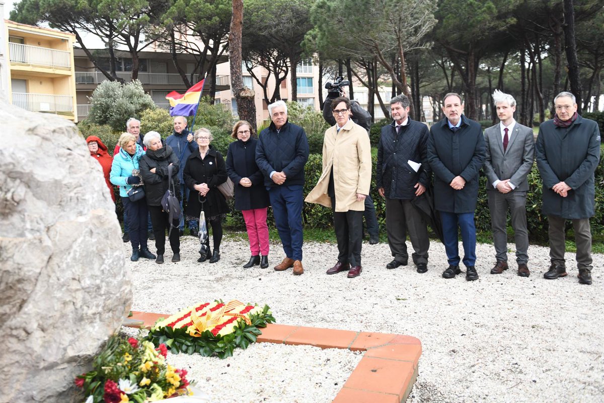 El presidente de la Generalitat, Salvador Illa (c), y el conseller de Justícia i Qualitat Democràtica, Ramon Espalader (3d), durante su visita al monolito del homenaje a los refugiados del campo de concentración de Argèles-sur-mer, a 7 de marzo de 2025, e - Glòria Sánchez - Europa Press