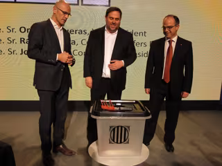 BARCELONA, 29 Sep. (EUROPA PRESS) - El Govern ha mostrado este viernes por primera vez como son las urnas del referéndum, en la rueda de prensa que han ofrecido el portavoz, Jordi Turull; el vicepresidente, Oriol Junqueras, y el conseller de Exteriores, Raül Romeva. Durante la comparecencia Turull ha dicho: "Al final os enseñaremos un cosa", y, cuando han acabado las intervenciones, una persona de la Generalitat ha sacado esta urna y los tres consellers se han fotografiado con ella, sin añadir ningún comentario. Se trata de una urna de plástico, transparente en su cuerpo central y con una tapa negra, donde está la ranura para depositar los votos, y también se han podido ver precintos de color rojo que sirven para mantener la urna sellada. El Govern muestra las urnas después de una operación policial de este jueves de la Guardia Civil en Igualada en la que requisó cien urnas, pese a que los agentes se les aseguró que esas urnas eran para otro fin y no para el referéndum. El decreto de medidas complementarias que hizo el Govern para desarrollar la ley del referéndum --ambas iniciativas, suspendidas por el Tribunal Constitucional--, se establecía que las urnas del 1-O debían ser de "un material resistente con una tapa que incluirá una ranura en el centro por donde se introducirán los votos". Este viernes el Govern ha explicado en rueda de prensa que habrá 5.249 mesas electorales repartidas por toda Catalunya donde poder votar y, por lo tanto, se necesitarán al menos las mismas urnas.