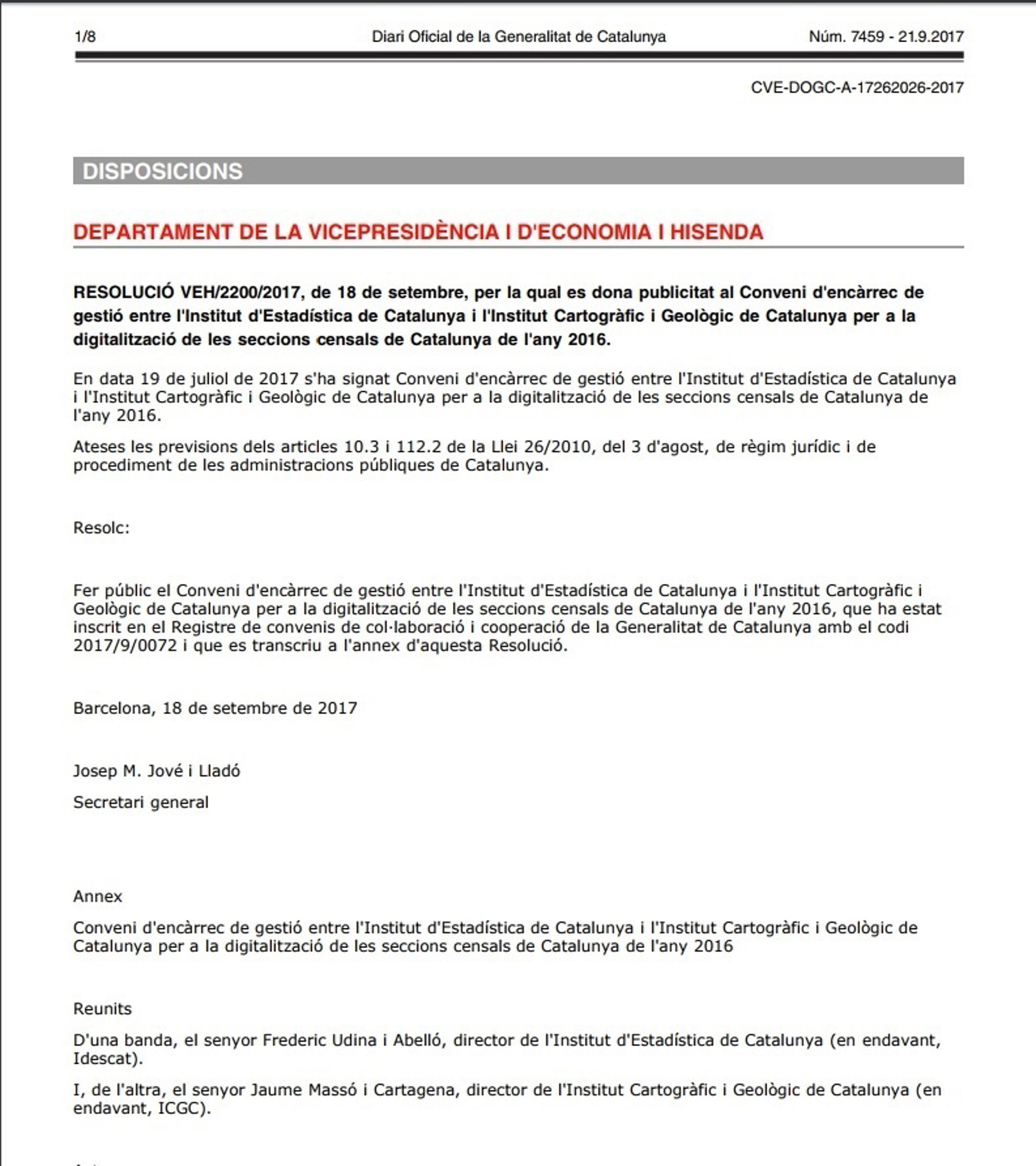 Sobre la actualización de las secciones censales, el acuerdo detalla que el Idescat aportará los datos de 2016 a partir de la información recibida por el Ine el 16 de marzo de 2017, y el Icgc aportará bases topográficas y otros datos, y hará "la reinterpretación y la digitalización" de unos datos que después enviará al Ine.