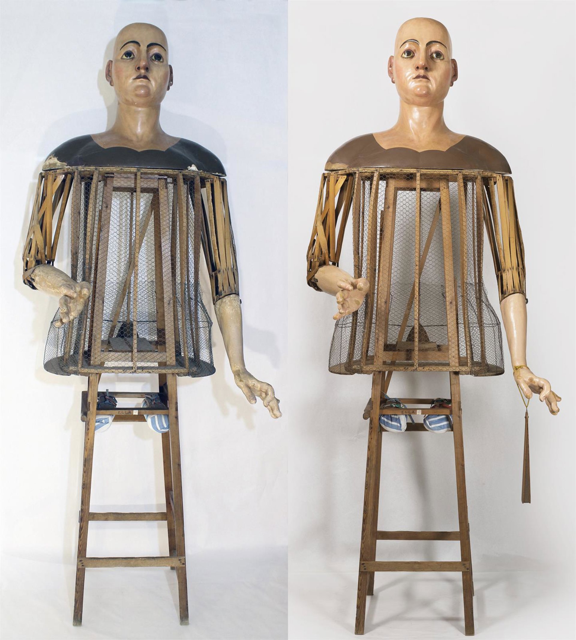 Se trata de unas figuras construidas para poder ser desmontadas sin necesidad de herramientas, que constan de una estructura de madera y alambrado de gallinero, que conforma el cuerpo, los brazos y los hombros, así como una estructura encima que es el busto, con unos brazos a cuyos extremos se encajan las manos.