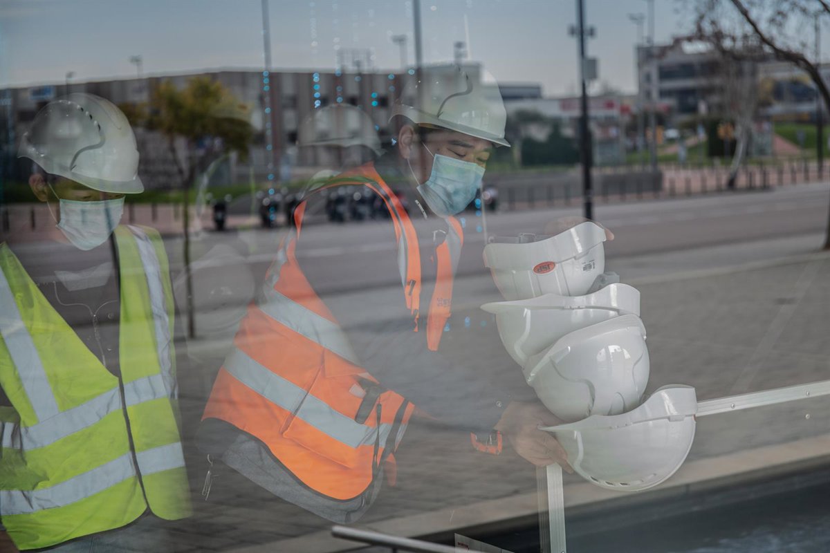 Dos trabajadores asiáticos colocan cascos blancos de obra en el pabellón del Mobile World Congress (MWC) durante el desmantelamiento de los stands de la feria, en Barcelona/Catalunya (España) a 13 de febrero de 2020. - David Zorrakino - Europa Press - Archivo