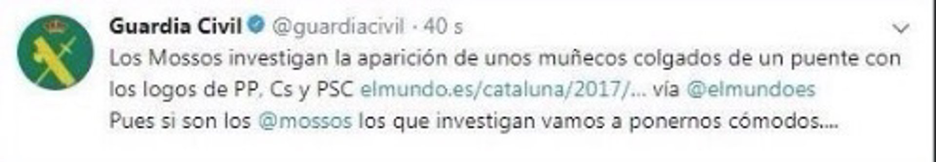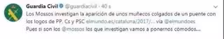 El tuit de la Guardia Civil decía: "Los Mossos investigan la aparición de unos muñecos colgados de un puente con los logos de PP, Cs y PSC. Pues si son los mossos los que investigan vamos a ponernos cómodos...".