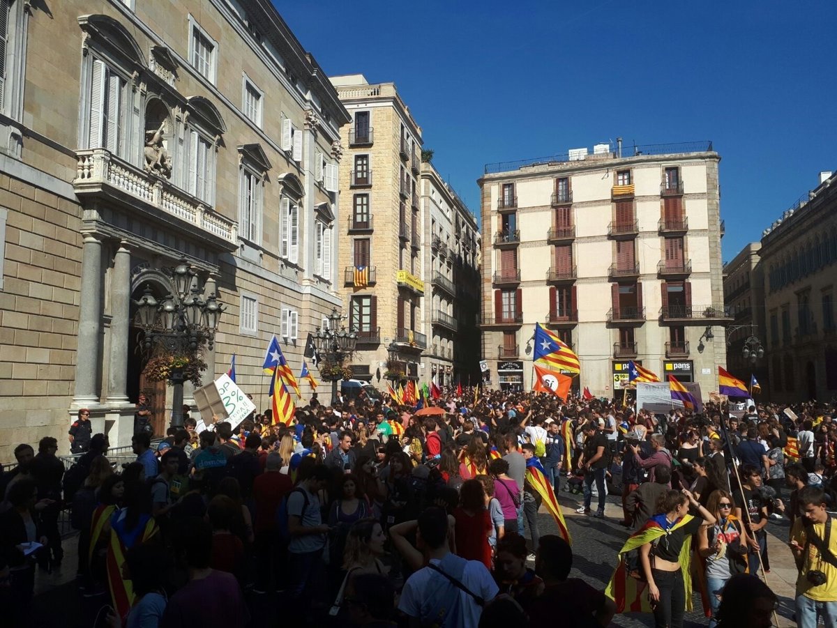 La manifestación, que ha concluido en la plaza Sant Jaume ante la Generalitat, ha partido de la plaza Universitat y ha pasado por la sede de Òmnium Cultural en solidaridad con su presidente, Jordi Cuixart, y con el presidente de la Assemblea Nacional Catalana (ANC), Jordi Sànchez.