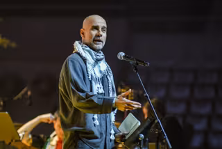 En la introducción del concierto, el entrenador catalán, con pañuelo palestino, ha recordado que cuando ve imágenes de niños en Gaza entre los escombros piensa: "Los hemos dejado solos y abandonados", mientras que los poderosos están en sus casas, ha dicho.