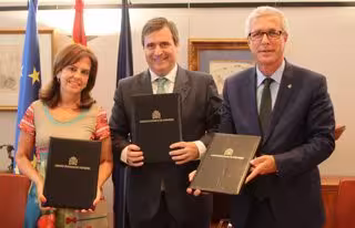Han rubricado el acuerdo la subsecretaria del Ministerio de Hacienda y Administraciones Públicas, Pilar Platero; el secretario de Estado de Deportes, Miguel Cardenal, y el alcalde de Tarragona, Josep Fèlix Ballesteros, en un acto en la sede del Consejo Superior de Deportes en Madrid.
