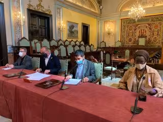 El conseller de Trabajo, Asuntos Sociales y Familias en funciones, Chakir el Homrani y el alcalde de Lleida, Miquel Pueyo, han firmado este miércoles el protocolo de colaboración entre las dos instituciones por el que la Conselleria pagará, con cuatro millones de euros, la construcción de un edificio comunitario multiusos en el barrio de Pardinyes que acogerá temporeros, previsiblemente, en la campaña de la fruta de 2022.