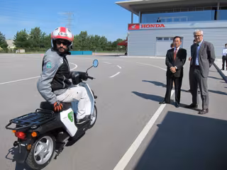 El presidente de Montesa Honda, Yukitoshi Fujisaka, ha presentado este jueves la prueba piloto en el Instituto de Seguridad de Montesa Honda de Santa Perpètua de Mogoda, acompañado del concejal de Movilidad del Ayuntamiento de Barcelona, Francesc Narváez, y el director de la Fundación RACC, Miquel Nadal.