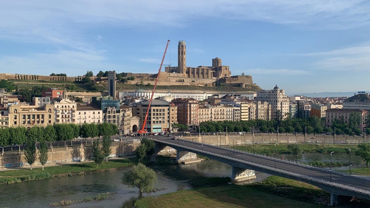 Una grúa en la Plaza Agelet i Garriga de Lleida en tareas de mantenimiento del edificio municipal Pallas vista desde Cappont - EUROPA PRESS