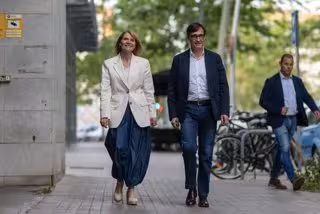 El candidato del PSC al 12M, Salvador Illa, y la viceprimera secretaria del PSC y directora de campaña, Lluïsa Moret, llegan a la sede del partido - LORENA SOPÊNA - EUROPA PRESS