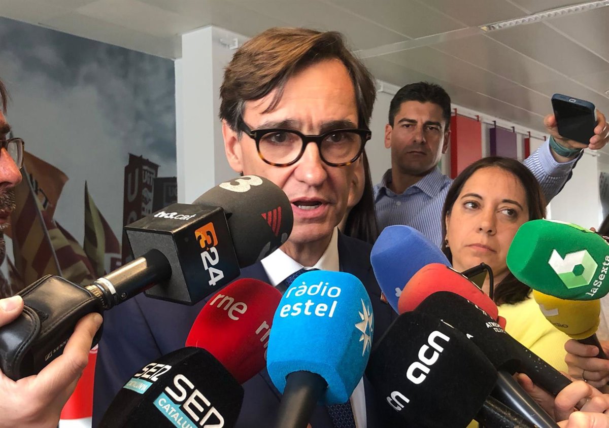 El primer secretario del PSC y candidato al 12M, Salvador Illa, en declaraciones a periodistas en la sede de UGT Catalunya - EUROPA PRESS
