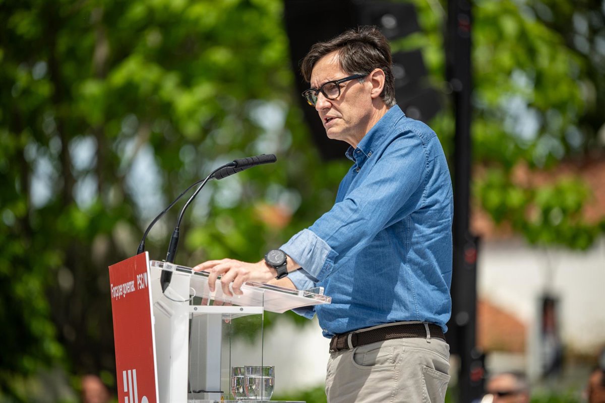 El líder del PSC y candidato a las elecciones catalanas, Salvador Illa, interviene durante un mitin del PSC, a 4 de mayo de 2024, en Montmeló, Barcelona, Catalunya (España). - Lorena Sopêna - Europa Press