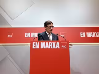 El primer secretario del PSC, Salvador Illa, en una rueda de prensa este lunes. - EUROPA PRESS