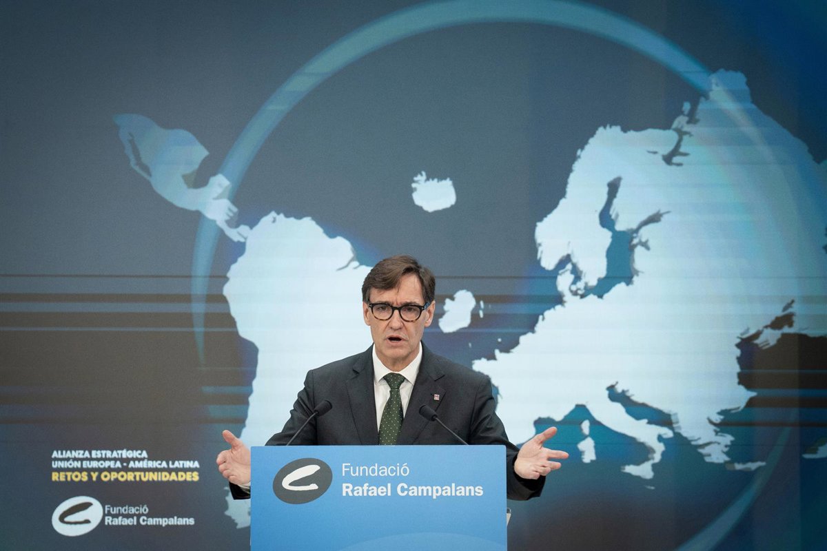 El líder del PSC, Salvador Illa, interviene durante la inauguración del seminario del PSC 'Alianza estratégica UE: retos y oportunidades'. - David Zorrakino - Europa Press
