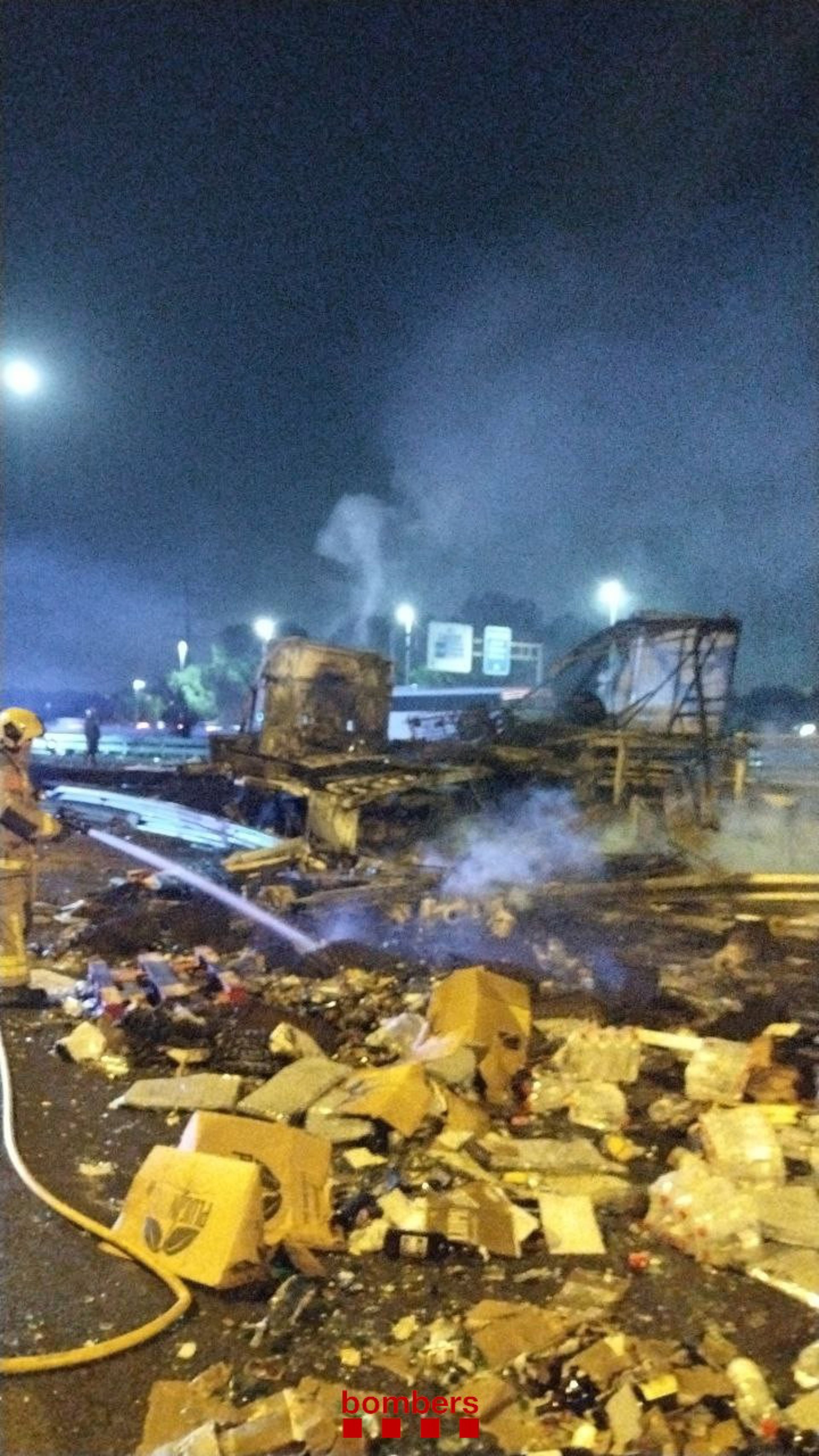 El accidente no ha dejado heridos y el camión no transportaba mercancías peligrosas, y los Bombers de la Generalitat han activado 10 dotaciones para apagar el fuego.