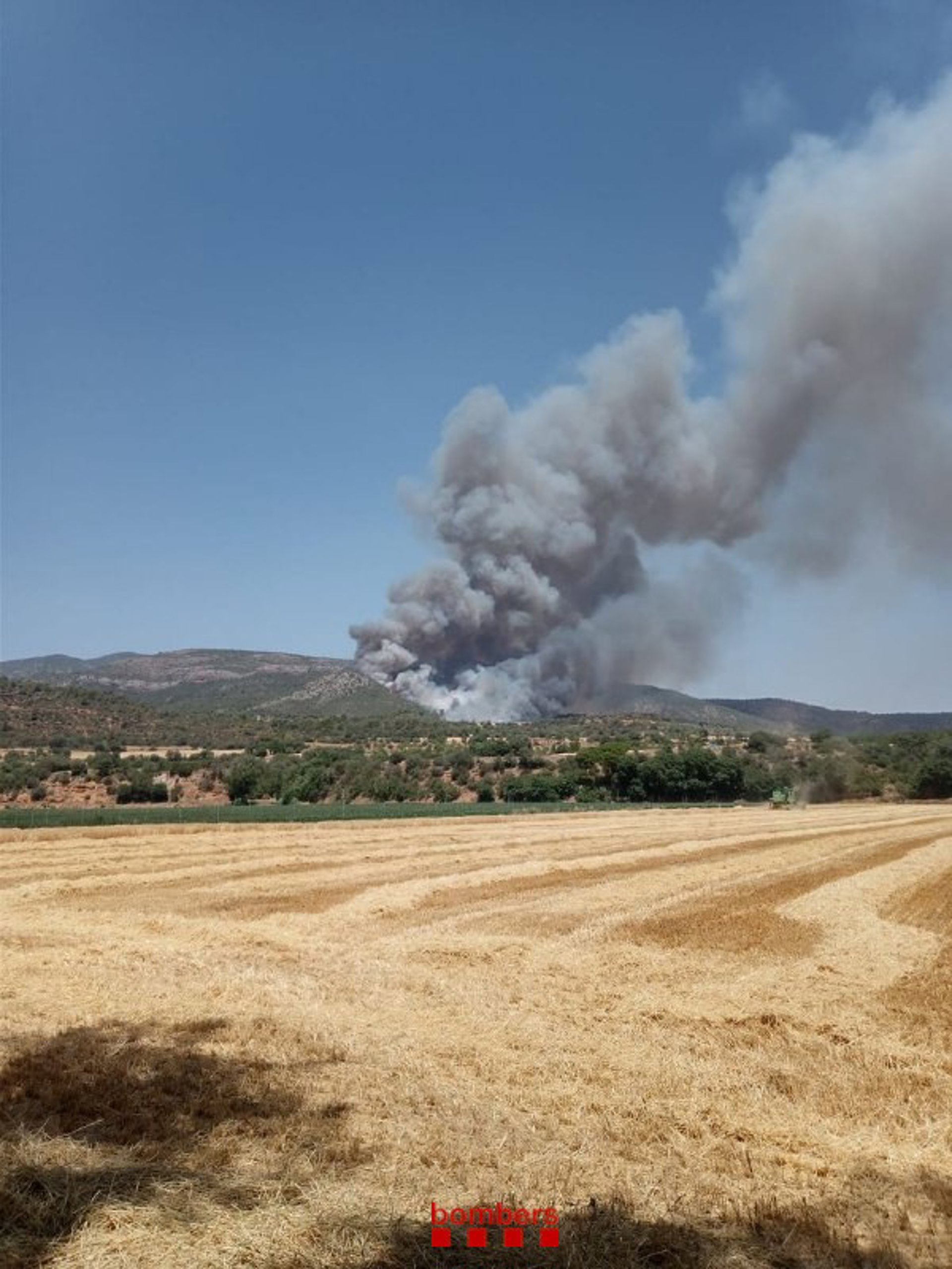 Los Bombers de la Generalitat tienen desplegadas 56 dotaciones, entre ellas nueve medios aéreos, 27 camiones de agua y 20 dotaciones de mando, para combatir las llamas que afectan una zona de bosque y cultivos.