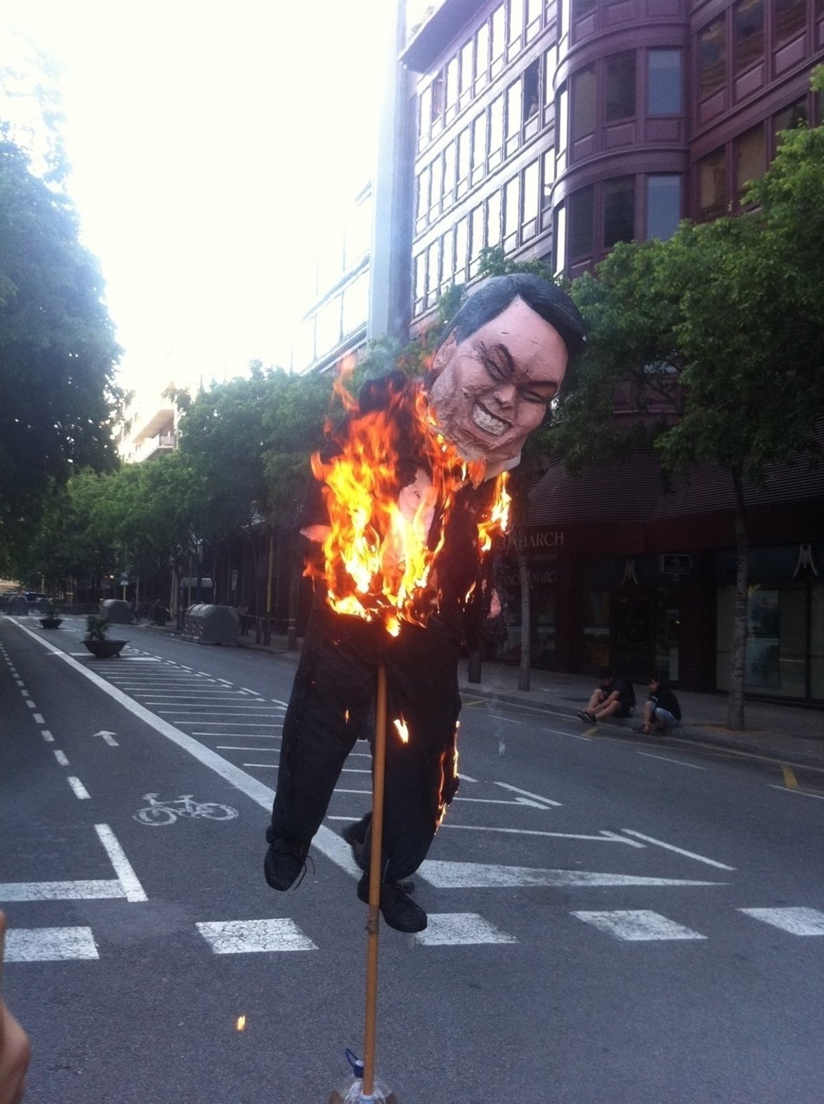 En el recorrido también han quemado un muñeco que simbolizaba al presidente de la Generalitat, Artur Mas, y algunos contenedores y un coche.