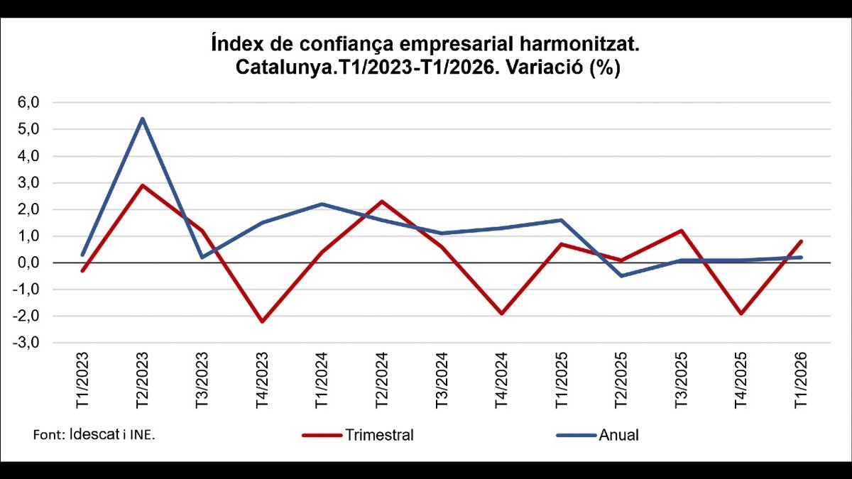 El índice de confianza empresarial de Catalunya ha aumentado un 0,2% en el primer trimestre de este año 2026, comparado con el mismo periodo del año pasado, informa el Institut d'Estadística de Catalunya (Idescat) este miércoles.