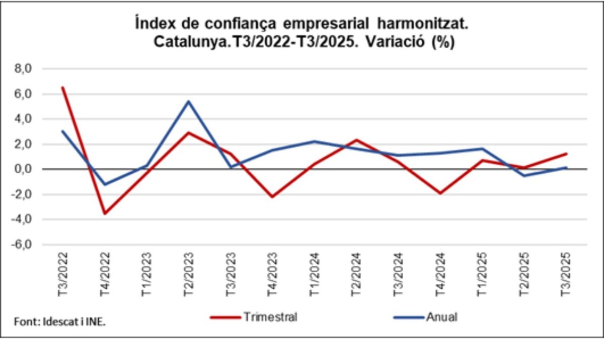 El índice de confianza empresarial armonizado de Catalunya ha aumentado un 1,2% en el tercer trimestre de 2025 respecto al trimestre anterior, un repunte especialmente relevante en los sectores del comercio y el resto de servicios (+2,0% en ambos casos) y el de la construcción (+0,8%).