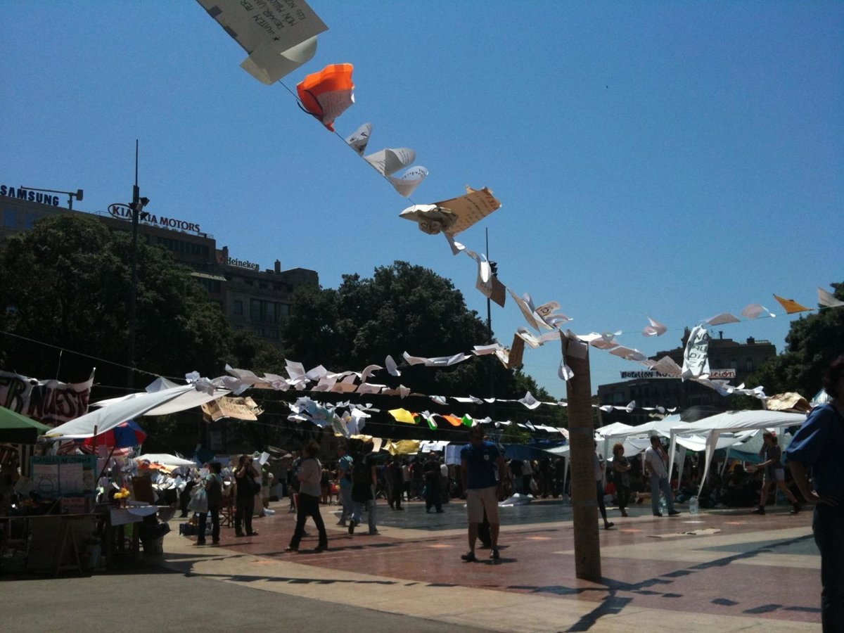 La plaza ha amanecido cubierta por un entramado de hilos de los que cuelgan cartones, papeles y telas con las reivindicaciones del colectivo, a modo de banderines de plegarias tibetanas --'huele a humanidad', dice una de ellas--.