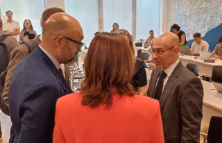 El ingeniero de caminos Luis Ubalde dialogando con la consellera de Territorio de la Generalitat, Sílvia Paneque, y el presidente de Adif, Luis Pedro Marco - EUROPA PRESS