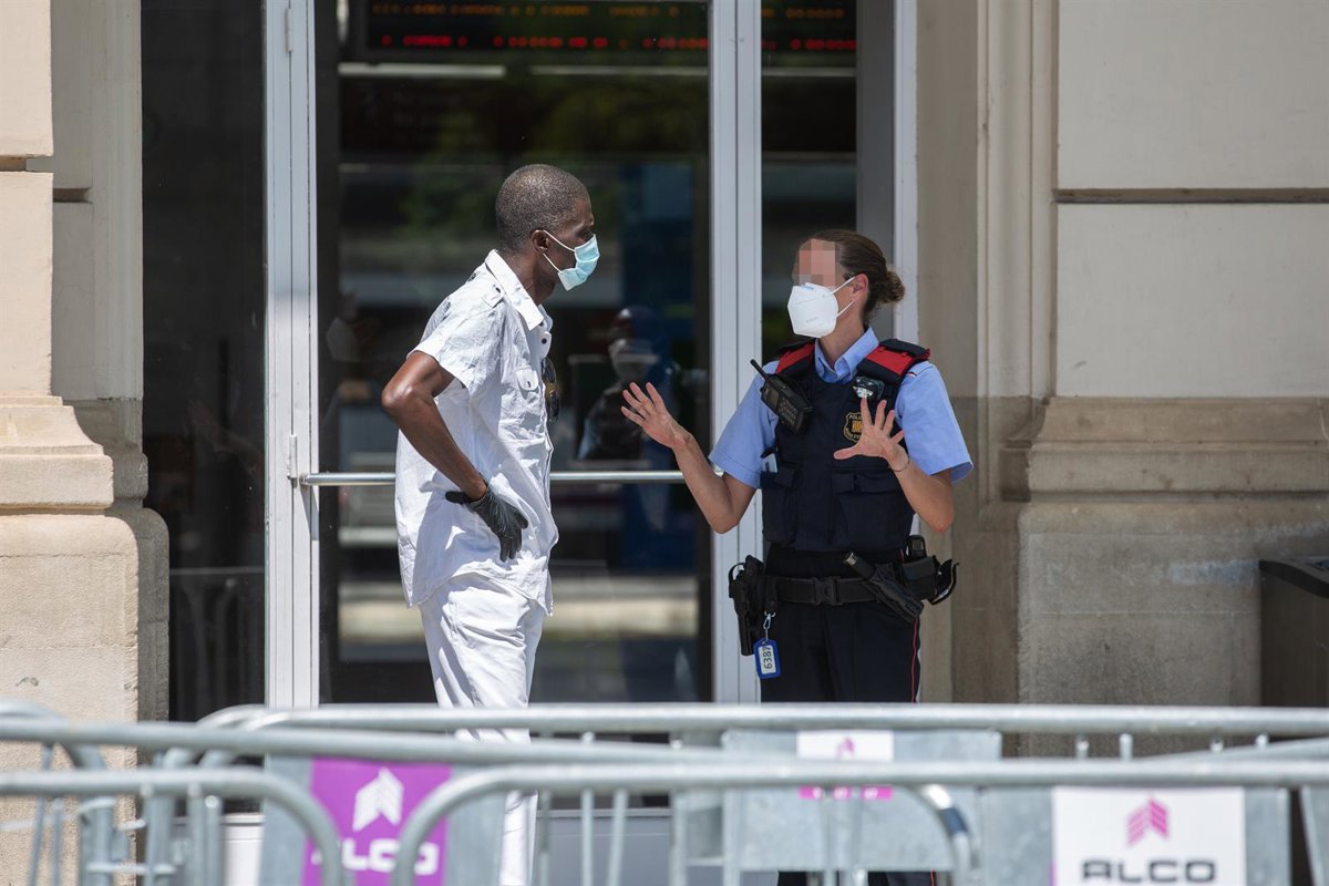 Un Mosso d'Esquadra habla con un hombre en la entrada de la Estación de Tren de Lleida, capital de la comarca del Segri, en Lleida, Catalunya (España), a 6 de julio de 2020. El presidente de la Generalitat, Quim Torra, anunció el pasado sábado el confi - David Zorrakino - Europa Press