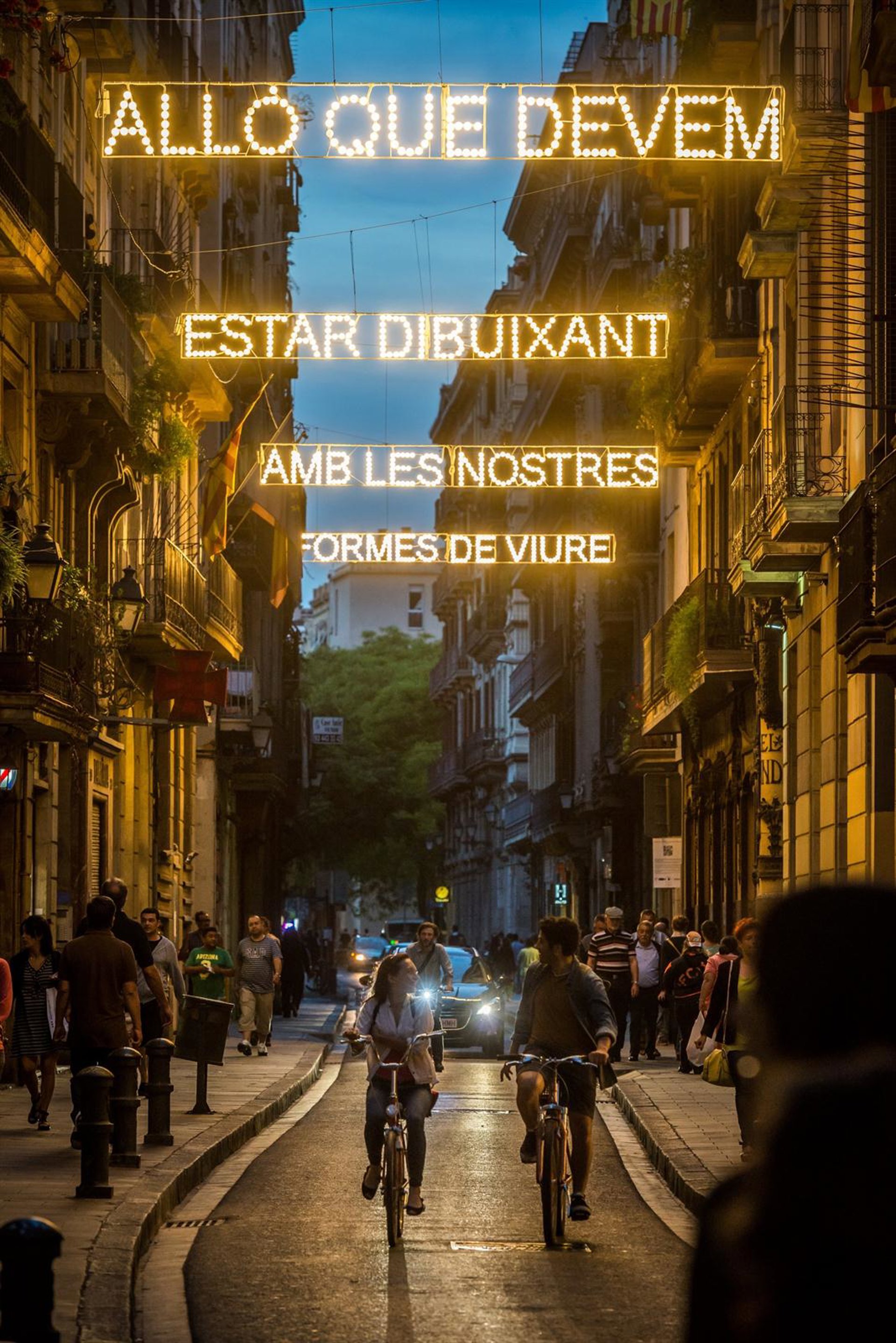Una instalación del artista catalán Perejaume iluminará la calle del Carme de Barcelona --entre la Rambla y la calle de Jerusalem-- con la frase 'Allò que devem estar dibuixant amb les nostres formes de viure' a partir de la tarde de este viernes y hasta el 31 de agosto.